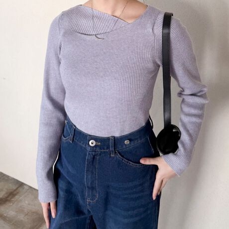 アシンメトリーなネックラインがポイントのリブニット