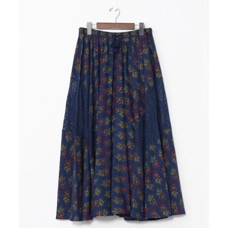 [型番:IDS-5304-2025]肌触りの良いインド綿を使用したレディーススカート。コットンのプリント生地とレース素材のパッチワークデザインで、大人かわいい印象に。着脱しやすいウエストゴム仕様。インドの伝統技法「ブロックプリント」を再現したオリジナルテキスタイルデザイン。