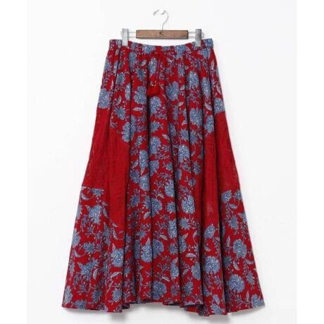 [型番:IDS-5304-2025]肌触りの良いインド綿を使用したレディーススカート。コットンのプリント生地とレース素材のパッチワークデザインで、大人かわいい印象に。着脱しやすいウエストゴム仕様。インドの伝統技法「ブロックプリント」を再現したオリジナルテキスタイルデザイン。