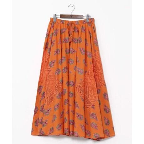 [型番:IDS-5304-2025]肌触りの良いインド綿を使用したレディーススカート。コットンのプリント生地とレース素材のパッチワークデザインで、大人かわいい印象に。着脱しやすいウエストゴム仕様。インドの伝統技法「ブロックプリント」を再現したオリジナルテキスタイルデザイン。