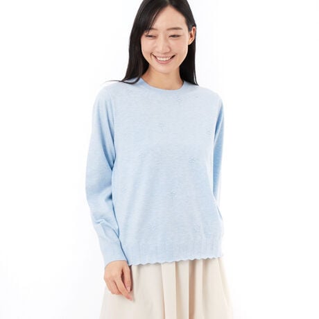 [型番:34850061]ソフトで滑らかな肌触りの、ウールアクリルナイロンのニットプルオーバー。凹凸感のあるリンクス編みで、前身頃に花柄をあしらいました。前裾にスカラップ編みを取り入れ、デザイン性にもこだわった1着です。コンパクトなサイズ感で、フェミニンでキレイ目な印象に仕上げました。後ろがボタンあきになっています。