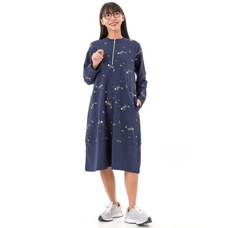 [型番:34920061]総プリントの裏毛ワンピース。デイジーを持った可愛らしいうさぎ柄を全面にプリントしました。フロントにムシ見せファスナーを取り入れ、アクセントとしています。吸水性、保湿性がよく、シーズンレスで実用性に優れたアイテムです。丈が長いアイテムにあると嬉しいポケット付き。