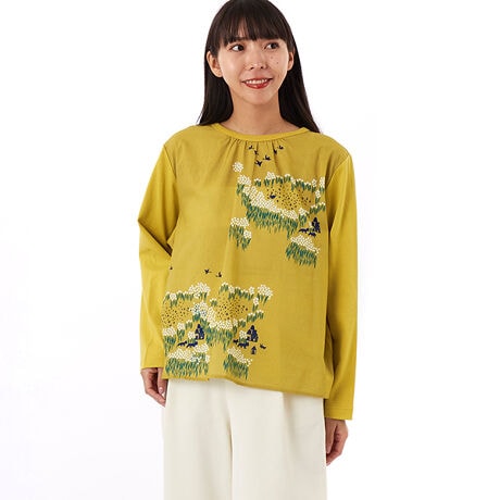 [型番:34950161]コットンローンとソフト天竺のコンビプルオーバー。柔らかい天竺で着心地の良い素材です。前身頃はコットンローンの布帛生地には、鳥たちの舞う風景をプリントしました。春の訪れを感じさせる一枚です。