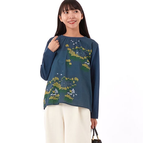 [型番:34950161]コットンローンとソフト天竺のコンビプルオーバー。柔らかい天竺で着心地の良い素材です。前身頃はコットンローンの布帛生地には、鳥たちの舞う風景をプリントしました。春の訪れを感じさせる一枚です。