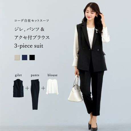 【 コーデ自在セットスーツ 】 ジレ&テーパードパンツ&アクセサリー付ブラウス3点セット