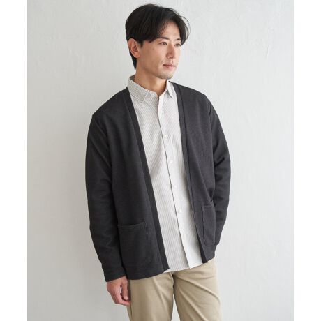 表裏が配色のダブルフェイス素材を用いたボタンレスカーディガン。