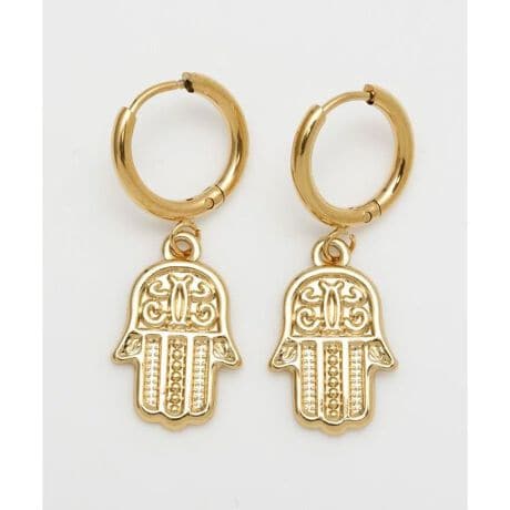 中東で古くから伝わる護符ハムサのモチーフのピアス。ハムサは邪視や悪霊から身を守るといわれる、幸福や幸運をもたらすシンボル。大切な人への贈り物にもおすすめです。