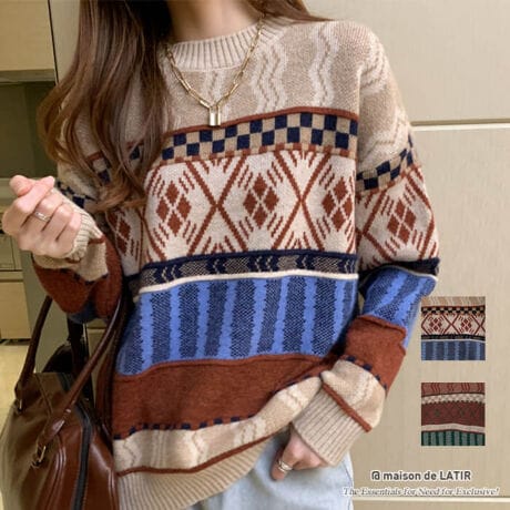パッチワークのように様々な柄がデザインされたカジュアルニット。