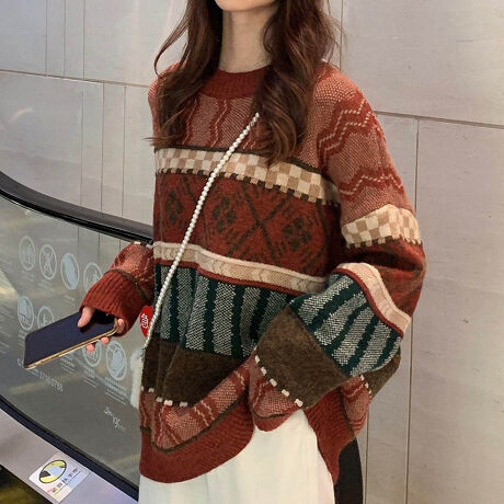 パッチワークのように様々な柄がデザインされたカジュアルニット。