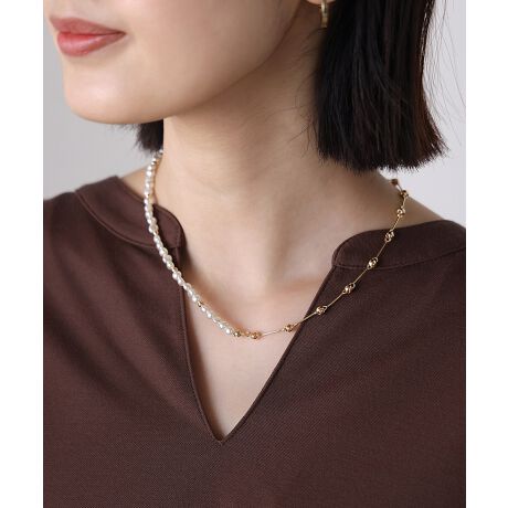 ゴールドとパールの飾りがアシンメトリーに配置されたデザイン性のあるネックレス。