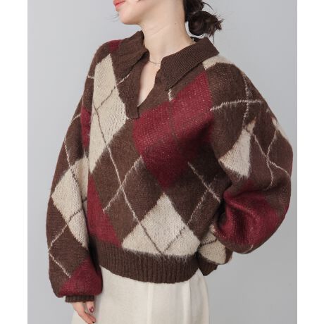 起毛感のあるモヘアライクな風合いで、見た目も肌触りも暖かいニットトップス。伝統的なアーガイル柄を現代的にアップデートし、旬のキーネックデザインで仕上げました。キーネックはデコルテラインをすっきりと美しく見せ、アクセサリー映えも抜群。程よいボリューム感がありながら、着膨れせずリラックスした着心地を実現。ボディラインを拾わず、さりげなく体型カバー。クラシカルな柄とトレンドデザインが融合したニットです。