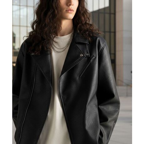 ハードすぎない絶妙なバランス感が魅力のフェイクレザーライダース。