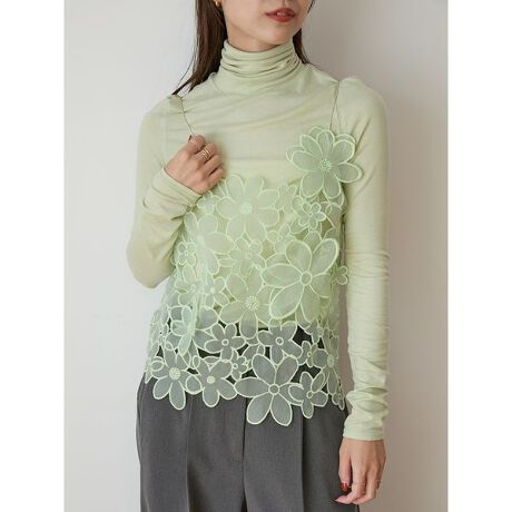 さらさらもちもちとした手触りが気持ちのよいハイネックインナー。薄手ながらふくらみがあり、柔らかなタッチが特徴的。