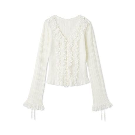 ヴィンテージライクな編み柄のニットに、構築的なフリル使いで今の気分を添えた主役カーディガンです。