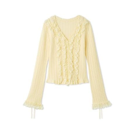 <b>【ヴィンテージ感のあるレース付きカーディガンで洒落た甘さを表現】</b>