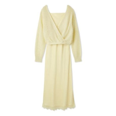 女性らしい艶と抜け感を兼ね備えた、キャミワンピースとニットプルオーバーのアンサンブルです。