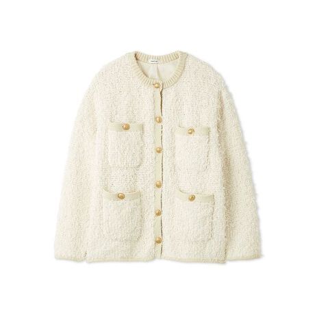 ニットならではの柔らかな着心地はキープしつつも、同色パイピングやゴールドボタンを効かせることで、よりジャケットライクな印象に。