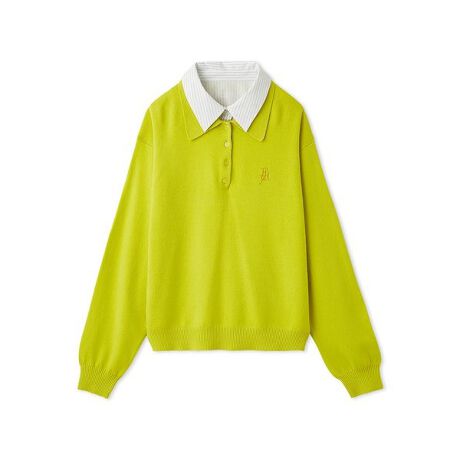 ポロカラーニットにシャツを重ねたようなレイヤード風トップスがトレンドライク。
