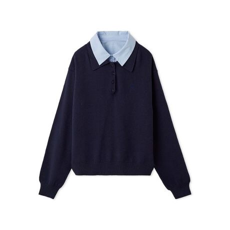 ポロカラーニットにシャツを重ねたようなレイヤード風トップスがトレンドライク。
