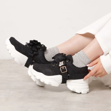 重なり合うリボンにキラリと光るビジューをあしらった、華やかなストラップ仕様で足元をアップデート♪