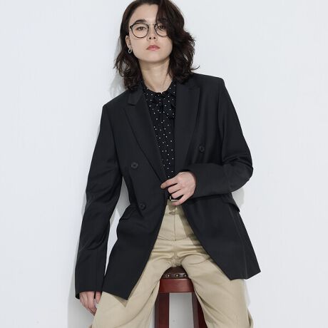 襟からポケットやボタン、絞りの位置まで全ての位置を上げ、重心を上にすることで目線を上げ、スタイルアップが期待できる独自のバランスにしたダブルジャケットです。