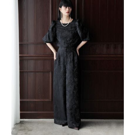 花柄だけでなくボタニカルをイメージしたペイズリー柄を織りまぜることで、パンツドレスに合う格好良い印象に。
