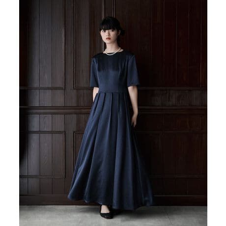 表面に抑揚が生まれるサテンならではの柔らかさととろみのある風合いで、落ち感が美しいAラインのシルエット。