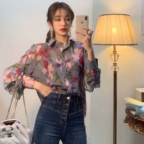 -ビンテージ感あるレトロな花柄が魅力的でおしゃれなシアーシャツです。