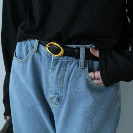 ゴールドのバックルがほんのり煌めいて、品のある華やかさを添えてくれるベルト。