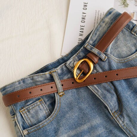 ゴールドのバックルがほんのり煌めいて、品のある華やかさを添えてくれるベルト。
