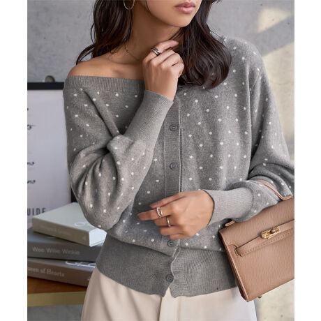 小ぶりのドットが可愛さもプラスし一枚で着映えるデザインニットカーディガンです。
