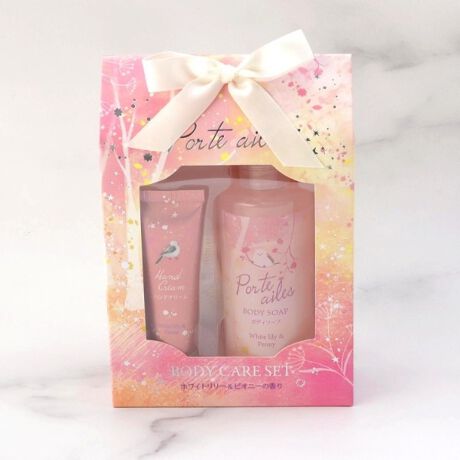 保湿成分配合のボディソープ、ハンドクリームとスポンジの3点が入ったボディケアセット。