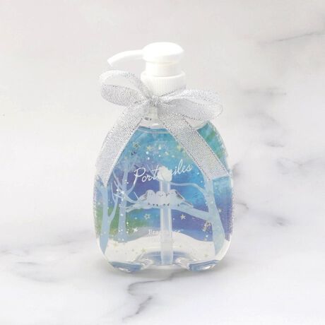 幻想的な森の風景を閉じ込めたスノードームのようなハンドソープ。ボトル内にイラストの入ったフィルムを入れて立体感を出しています。