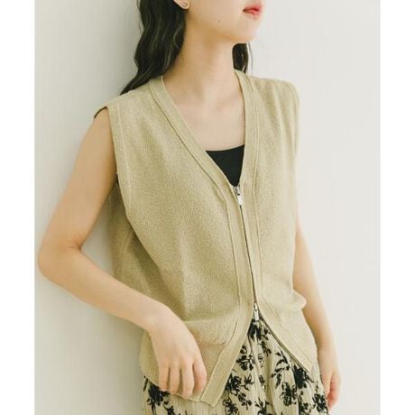 立体感のあるブークレ素材が目を惹くジップベストは、羽織るだけで大人カジュアルな印象に仕上がる万能アイテム。上下から開けられるダブルジップ仕様でシルエットの調整もしやすく、腰回りもすっきりと見せてくれます。Tシャツやシャツ、ワンピースとのレイヤードにも好相性で、季節の変わり目にも重宝。着回し力抜群で、ワードローブにプラスしたい一着です。