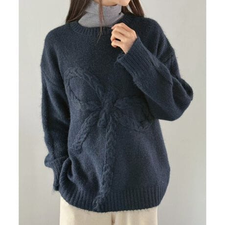 ケーブル編みの大きなリボンディテールがポイントのニットプルオーバー。