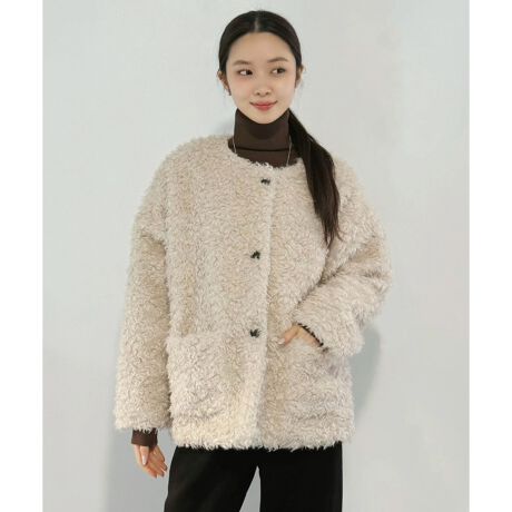 ノーカラーのラウンドネックがすっきりとした印象のミディアム丈コート。