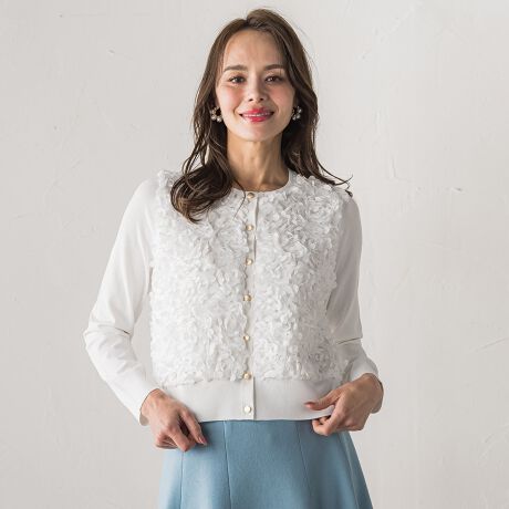 花びらのモチーフを敷き詰めた華やかなドッキングカーディガン。