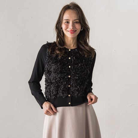 花びらのモチーフを敷き詰めた華やかなドッキングカーディガン。