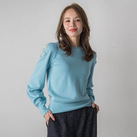 袖山に施したパールが煌びやかなニットプルオーバーです。