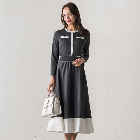 ネックや前立て、ウエスト、ポケット、ヘムラインに配色使いを効かせた、着心地の良いニットワンピースです。