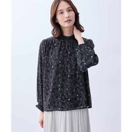 [型番:351680]日常を華やかにするジャガードブラウス繊細なジャガードが目を引く上品ブラウス。高めのスタンドカラーとギャザーが顔まわりをすっきりと見せ、袖口のシャーリングがさりげないポイントに。デニム合わせで大人カジュアルに、スカートと合わせればきれいめにも着映える万能トップスです。一枚でコーデが完成する華やかさが魅力で、オンにもオフにも活躍します。