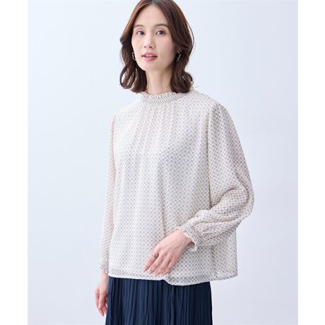 [型番:351680]日常を華やかにするジャガードブラウス繊細なジャガードが目を引く上品ブラウス。高めのスタンドカラーとギャザーが顔まわりをすっきりと見せ、袖口のシャーリングがさりげないポイントに。デニム合わせで大人カジュアルに、スカートと合わせればきれいめにも着映える万能トップスです。一枚でコーデが完成する華やかさが魅力で、オンにもオフにも活躍します。