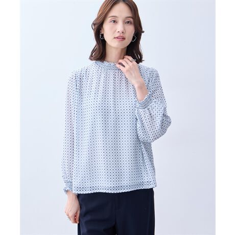 [型番:351680]日常を華やかにするジャガードブラウス繊細なジャガードが目を引く上品ブラウス。高めのスタンドカラーとギャザーが顔まわりをすっきりと見せ、袖口のシャーリングがさりげないポイントに。デニム合わせで大人カジュアルに、スカートと合わせればきれいめにも着映える万能トップスです。一枚でコーデが完成する華やかさが魅力で、オンにもオフにも活躍します。