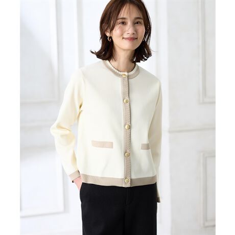 [型番:352677]配色で魅せる上品クラシカルなニットカーデフロントや裾、袖口に施した配色ラインがクラシカルな印象をつくるニットカーデ。ほどよい厚みで着心地がよく、羽織りとしてはもちろん、ボタンを留めてプルオーバー風にも着られる万能アイテム。スカート合わせで上品に、デニムで大人カジュアルにも楽しめます。コーデのアクセントになる一枚で、季節の着回しに活躍します。