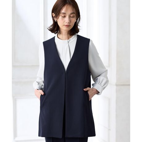 すっきりとしたロングシルエットがスタイルをきれいに見せるジレジャケット。