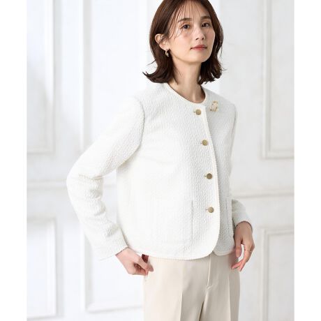 [型番:355614]きちんとも日常も上品に羽織れるツイードジャケット柔らかな表情のツイード素材で仕上げたノーカラージャケット。フロントのボタンがさりげないアクセントになり、すっきりとしたシルエットで着回しやすい一枚。Tシャツに羽織れば大人カジュアルに、ワンピースやスカートと合わせればきれいめスタイルにも馴染みます。シーズン問わず活躍する万能アイテムです。