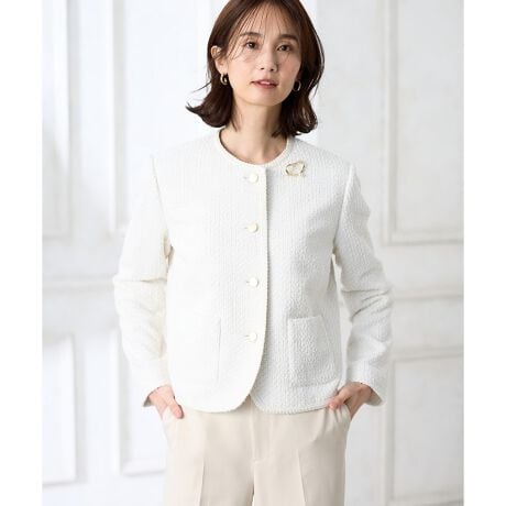 [型番:355614]きちんとも日常も上品に羽織れるツイードジャケット柔らかな表情のツイード素材で仕上げたノーカラージャケット。フロントのボタンがさりげないアクセントになり、すっきりとしたシルエットで着回しやすい一枚。Tシャツに羽織れば大人カジュアルに、ワンピースやスカートと合わせればきれいめスタイルにも馴染みます。シーズン問わず活躍する万能アイテムです。