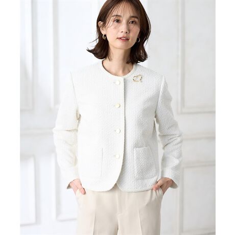 柔らかな表情のツイード素材で仕上げたノーカラージャケット。