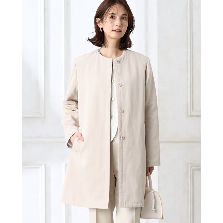 [型番:355615]洗練シルエットが魅力の上品ノーカラーコートすっきりとした首元が上品な印象をつくるノーカラーコート。シンプルながらも美しいシルエットで、デイリーから通勤スタイルまで幅広く活躍。軽やかな着心地ながら、きちんと見えするデザインが魅力です。パンツでシャープに、スカートやワンピースと合わせて女性らしくも楽しめる万能アイテム。長い季節に寄り添う一着です。
