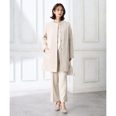 [型番:355615]すっきりとした首元が上品な印象をつくるノーカラーコート。シンプルながらも美しいシルエットで、デイリーから通勤スタイルまで幅広く活躍。軽やかな着心地ながら、きちんと見えするデザインが魅力です。パンツでシャープに、スカートやワンピースと合わせて女性らしくも楽しめる万能アイテム。長い季節に寄り添う一着です。